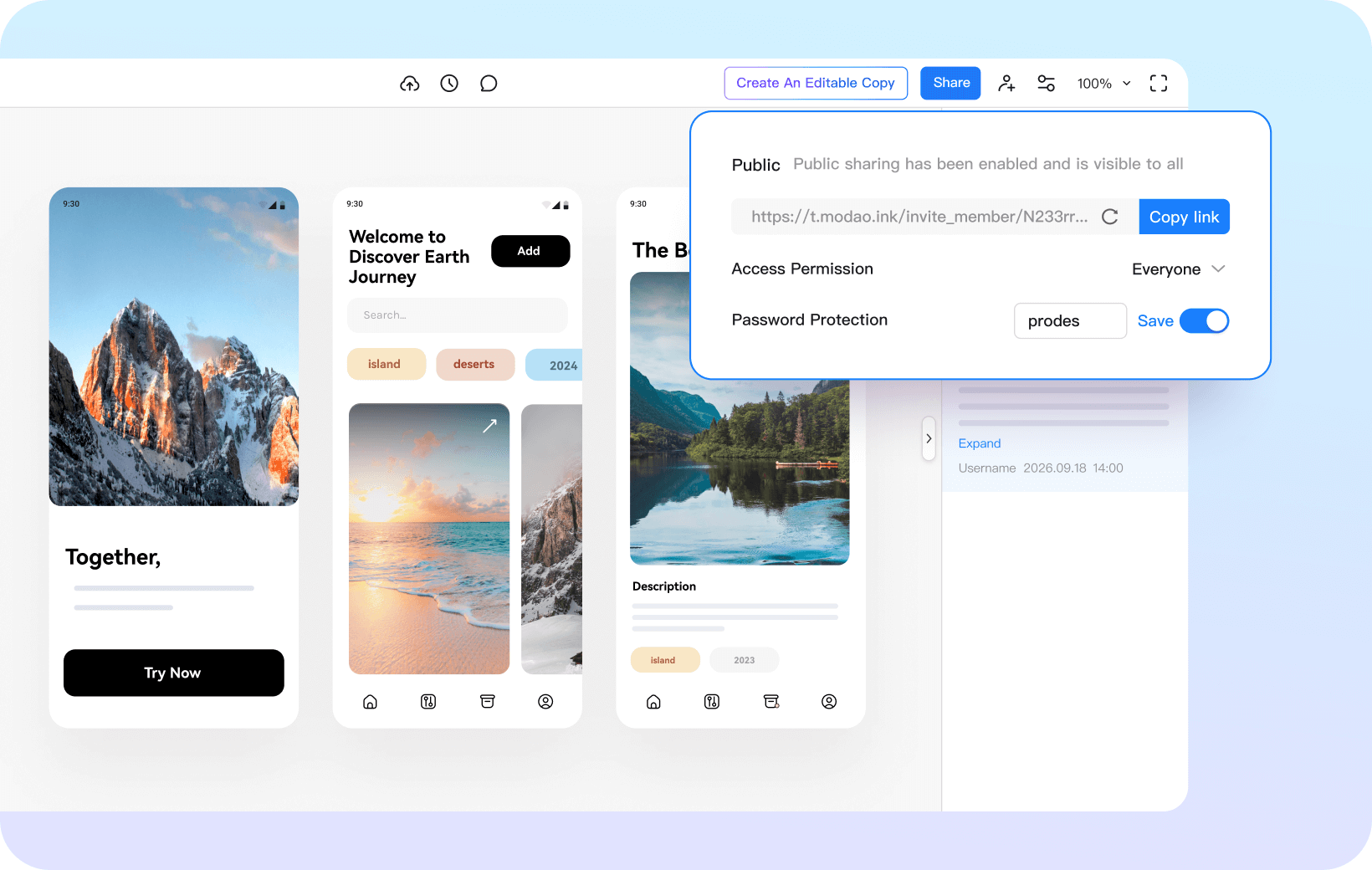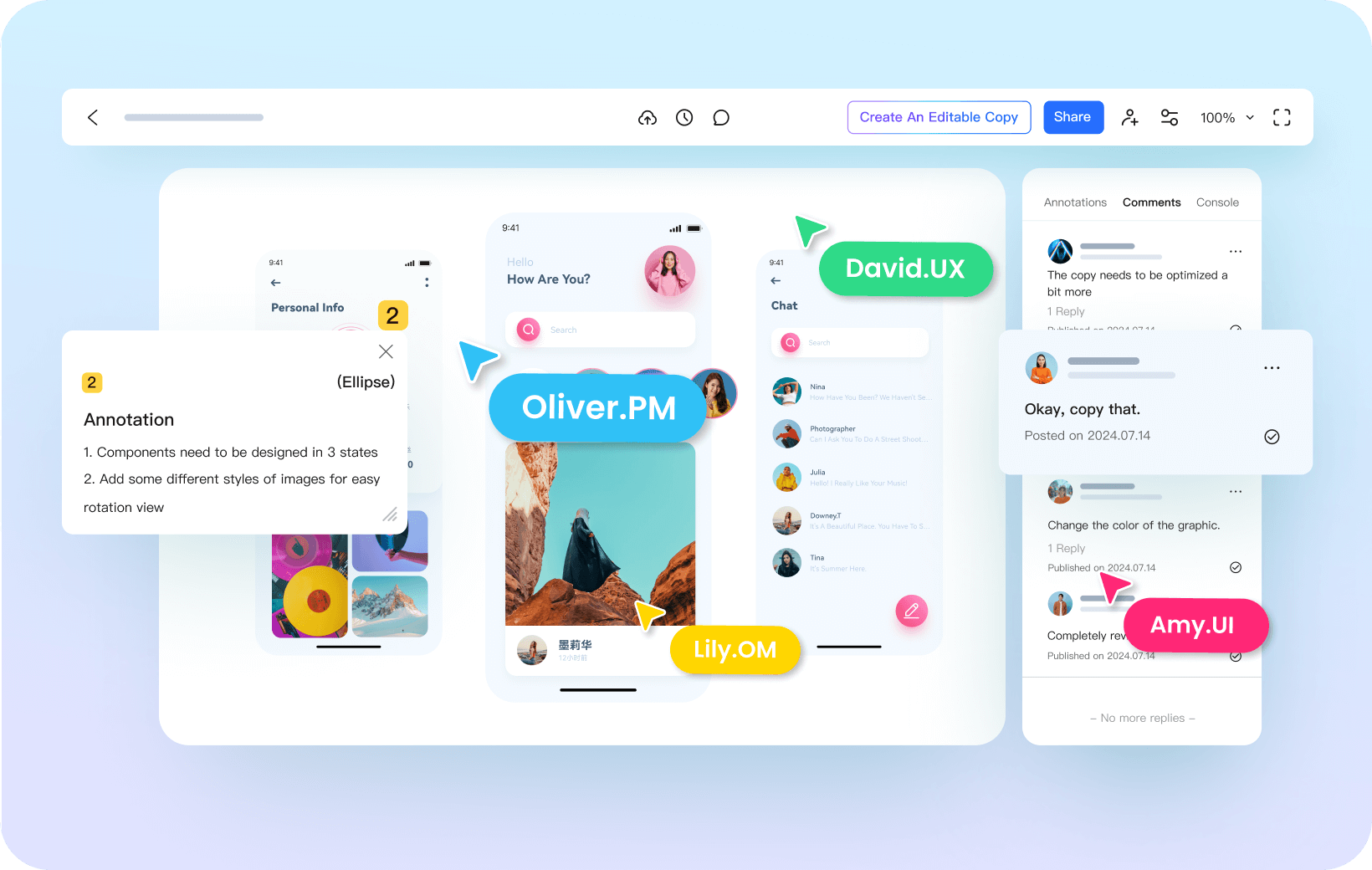 Prodes supports real-time online collaboration, team members can edit, comment and communicate on the prototype at the same time, and the files are saved to the cloud and can be accessed directly through the link, so sharing and collaborating is very efficient!