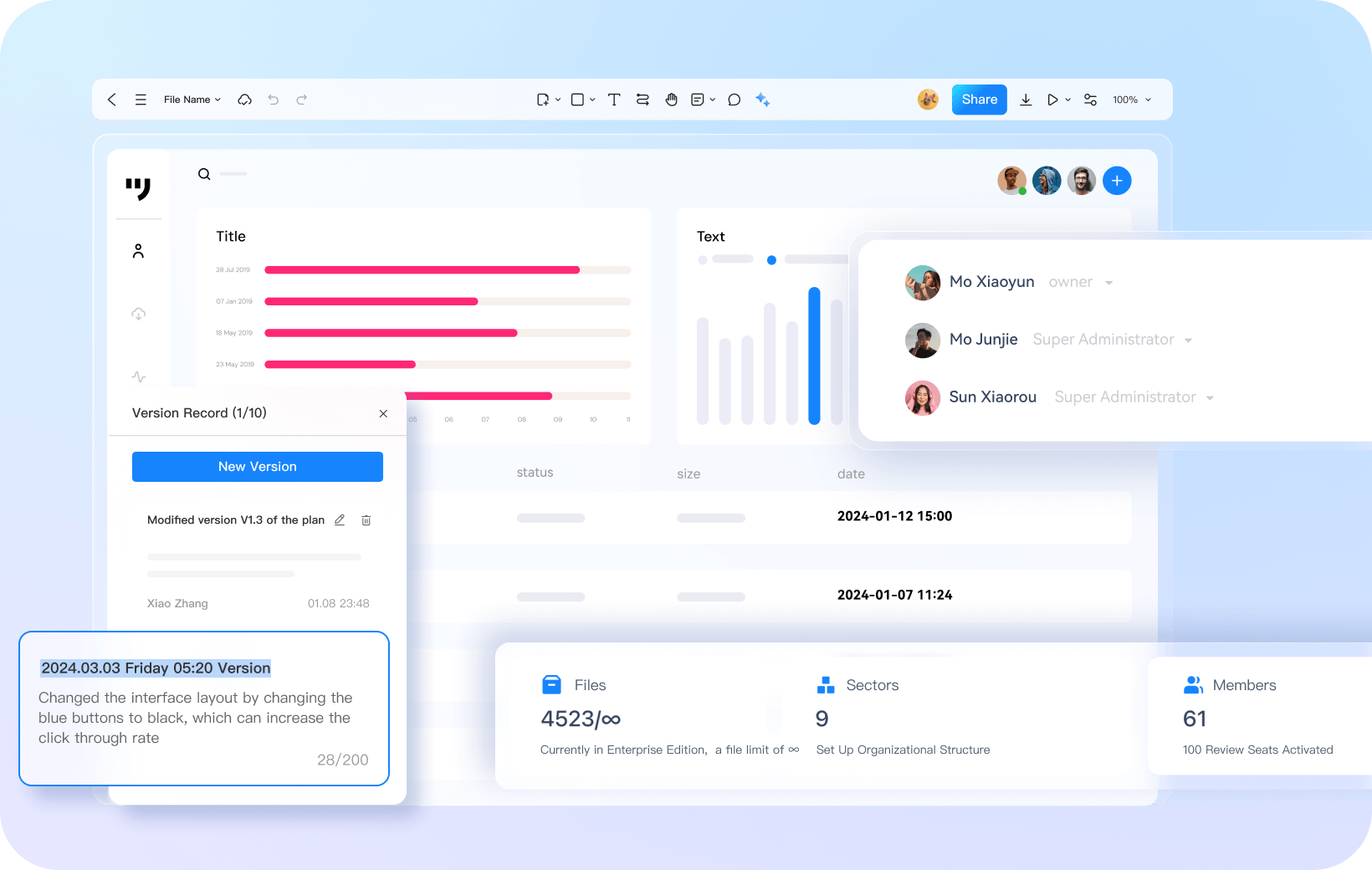 Prodes supports manual and automatic creation of version logs, unlimited historical versions of files, cloths, pages and team spaces, allowing users to easily view, compare and restore different versions to ensure data security